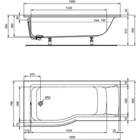 Caractéristiques techniques de la baignoire bain douche 170 x 80 asymétrique Connect Air gauche Ideal Standard
