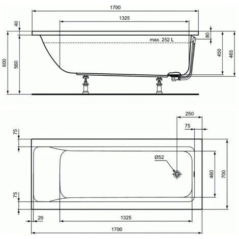 Caractéristiques de la Baignoire 170x70x46.5cm en acrylique, Blanc, Ideal Standard Connect Air (R000601) :