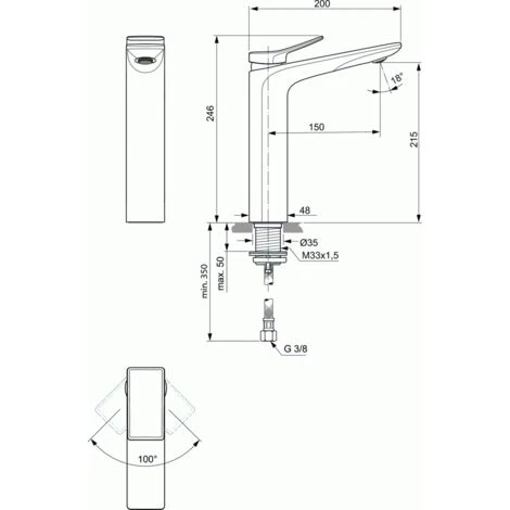 Caractéristiques techniques du mitigeur lavabo réhaussé sans tirette sans vidage Ideal Standard Conca