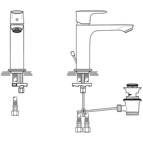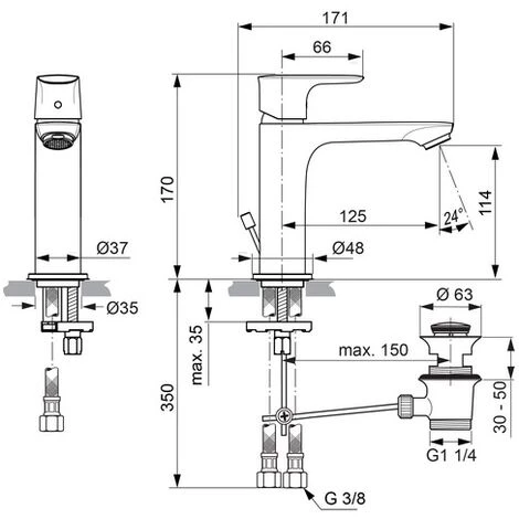 DN 15 avec un corps mince, bec rigide, le diamètre de corps de 37 mm, mm Sockelmaß 48 mm aérateur avec anneau métallique et régulateur de débit indépendante de la pression 5 l / min, vidage G 1 1/4 », projection 125, la hauteur de sortie 114 mm, les tuyau