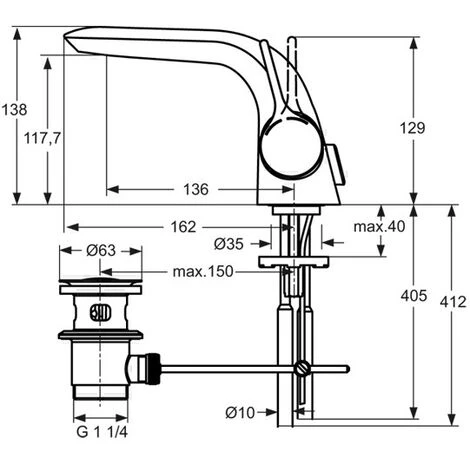 un bec rigide, aérateur interne, des tuyaux en cuivre, Ø 35 mm cartouche à disques céramiques, intégré température de l’eau chaude limitatif, fixation par le bas (EASY FIX), saillie 136 mm, la hauteur de buse 118 mm
