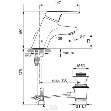 Résiste aux chocs thermiques jusqu‘à 80° C pendant 60 mn. Bec fondu fixe avec jet incliné. Manette pleine en métal. Brise jet antibactérien et Anticalcaire. Aérateur limiteur de débit 5 l/mn. Cartouche Ø40 mm avec limiteur de température réglable. Flexibles d‘alimentation SPX 350 mm. Technologie idealblue : l‘eau circule dans un conduit en hostaform et n‘est pas en contact direct avec le bec de la robinetterie. Hauteur sous aérateur 73 mm. Hauteur totale 150 mm. Projection 136 mm