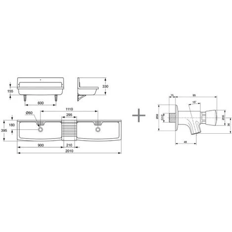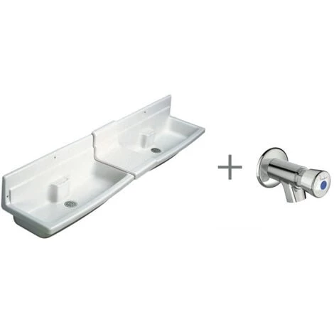 Pack 2 robinetteries temporisées murales Olyos Tempo – Chrome + lavabo collectif Thoiry 900 x 395 mm Contour 21 – Blanc