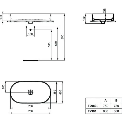 Vasque à poser Ideal Standard Strada II 75×40 sans trou pour robinet ni trop-plein